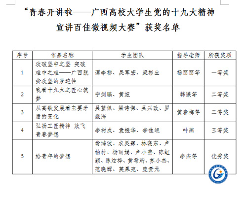 近日,广西壮族自治区高等教育工作委员会和教育厅公布了2017年度“青春开讲啦——广西高校大学生党的十九大精神宣讲百佳微视频”大赛评审结果。经过高校申报、专家评审、教育厅审核,全区共评出一等奖10项、二等奖20项、三等奖27项、优秀奖43项。我院师生在此次大赛中所获成果引人瞩目,由学院选送的5项作品全部获奖,其中包括一等奖1项,二等奖2项、三等奖1项和优秀奖1项。
