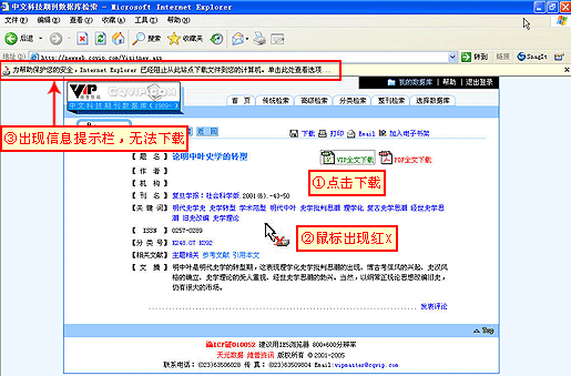 用户安装XP SP2版本后,不能正常下载,具体情况如图1,用户进入下载页面,点击下载后,鼠标出现红X,然后地址栏下出现提示栏,无法完成下载。