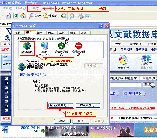 在“安全”选项卡上,单击“internet”,然后选择“自定义级别”。