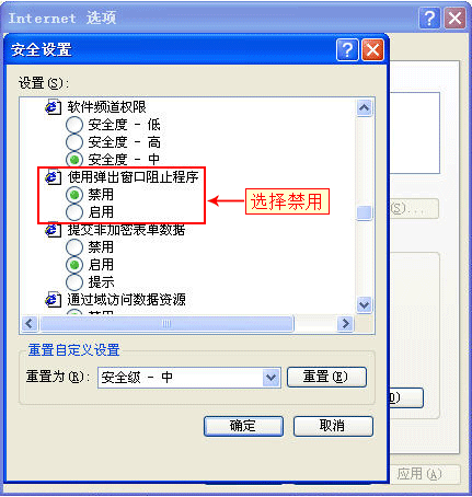 请在列表的“其他”部门的“使用弹出窗口阻止程序”,单击“禁用”。如图4