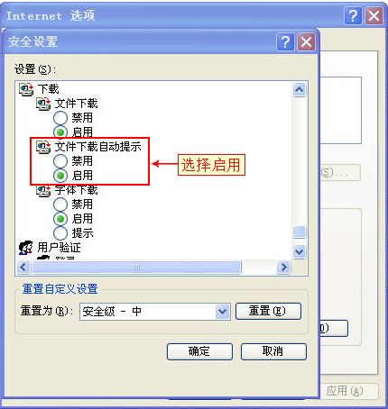 请在列表的“下载”部分的“自动提示文件下载”下,单击“启用”。如图5